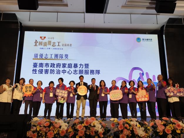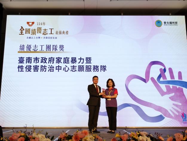 明(5)日為國際志工日(International Volunteer Day),這個節日自1985年由聯合國訂定,旨在表揚志工無私奉獻,並鼓勵民眾參與志願服務。衛生福利部響應此理念,於11月28日在大直典華幸福大樓舉辦「114年全國績優志工表揚典禮」,臺南市家庭暴力暨性侵害防治中心(家防中心)志願服務隊榮獲「全國績優志工團隊獎」,由衛生福利部呂建德政務次長親自頒獎。臺南市長黃偉哲特別致贈花束祝賀,家防中心主任楊逸宏代表接受表彰,感謝志工長期投入防治工作。