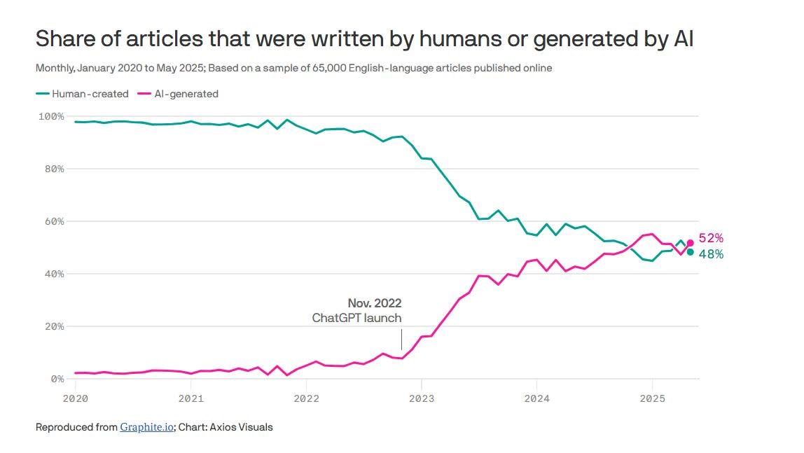 Graphite 團隊針對全球上億筆超過 500 字的英文網頁資料庫進行分析,隨機抽取 2020 至 2025 年間共 6.5 萬篇文章,並以自家訓練的 AI 模型判斷內容是否由 AI 所生成。結果顯示,自從 2022 年 ChatGPT 問世後,AI生成內容的比例急遽上升;到了 2024 年與 2025 年,AI創作已正式超過人類創作的比重。