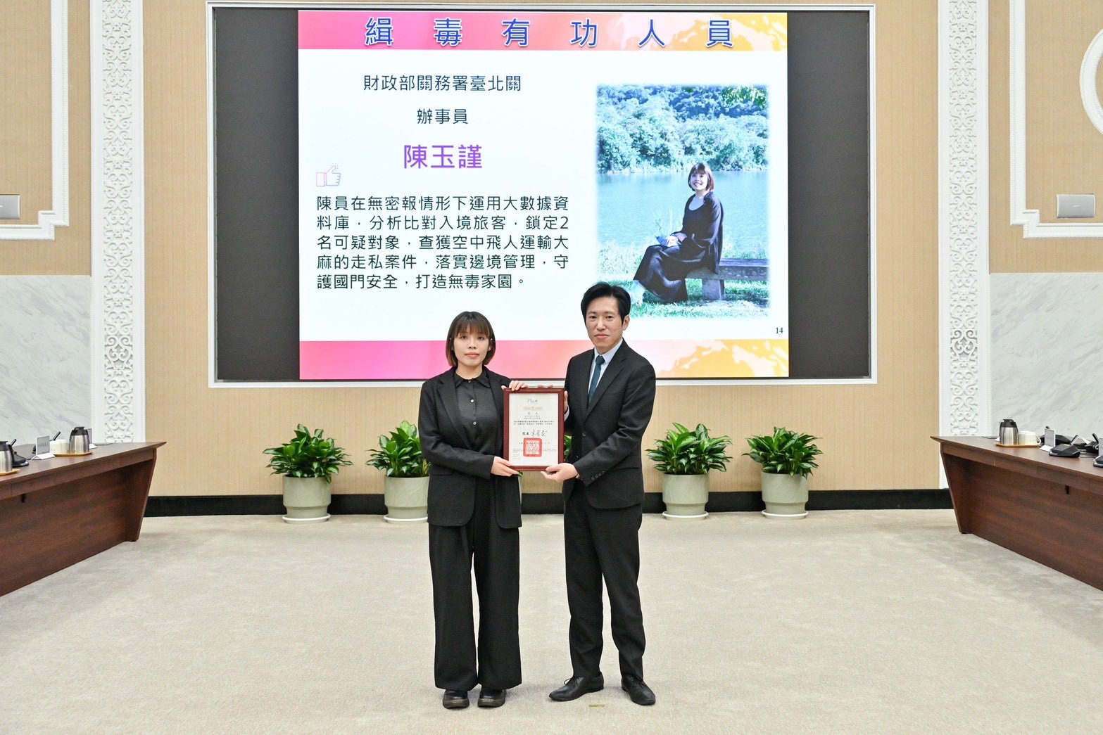 會議開始前,張惇涵頒獎表揚「第13波安居緝毒專案」及重大緝毒案件中的20位有功人員。他致詞時轉述行政院長卓榮泰的期許,指出公務人員是國家治理的堅實力量,獲獎者更是其中的典範。他並請六大緝毒系統首長持續鼓勵第一線未受表揚的查緝英雄,肯定其在高風險環境中的付出與專業精神。