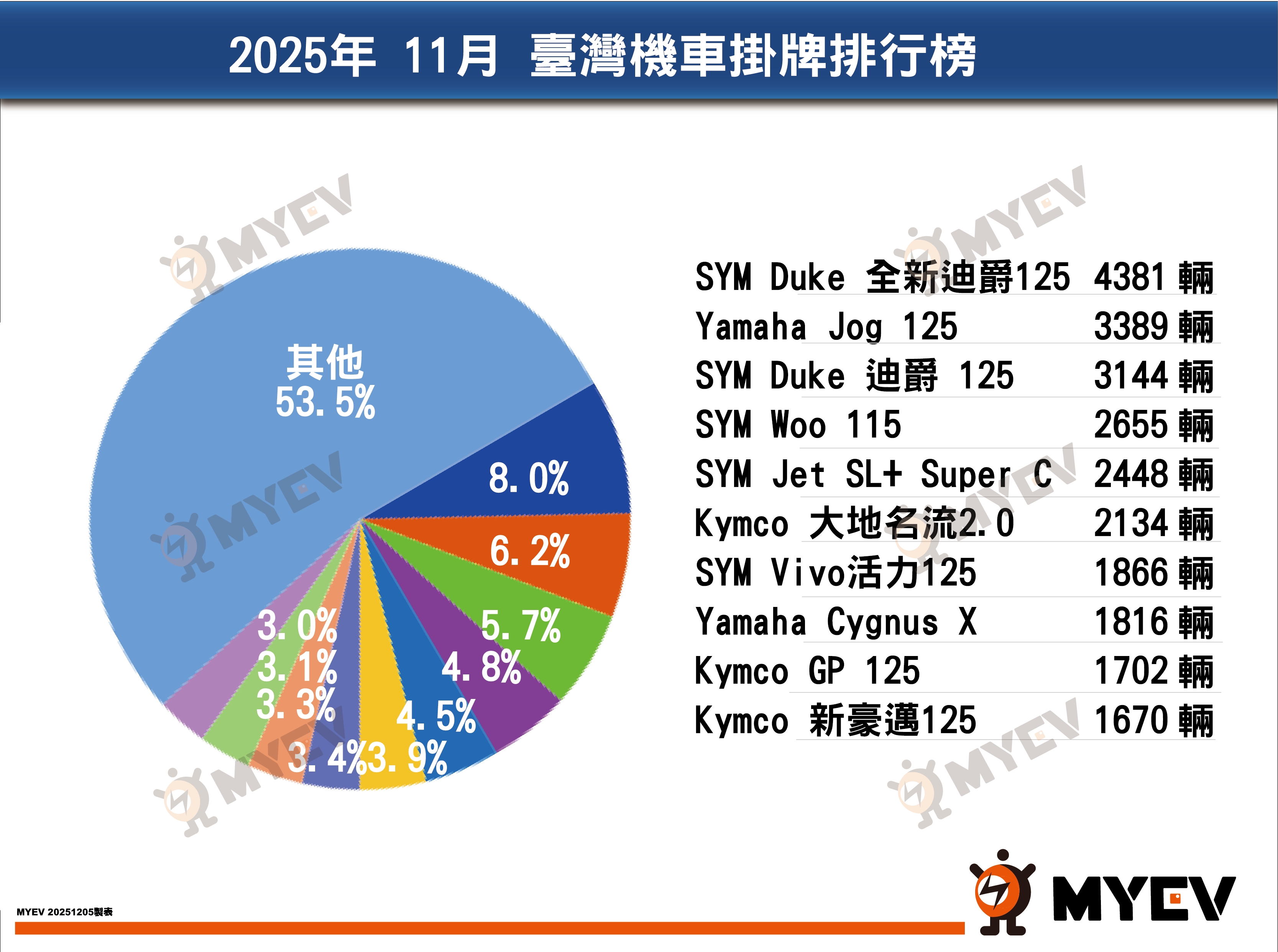 Yamaha11月掛牌9,897輛,市占18.2%,較10月衰退19.3%,較去年同期下滑8.4%。主要車款Jog掛牌3,390輛,7代勁戰125掛牌1,816輛,表現不及預期;NMax改款車型掛牌218輛;電動車CuxiE掛牌170輛,銷量呈現下探趨勢。12月7代勁戰155車型即將交車,將成為市場關注焦點。