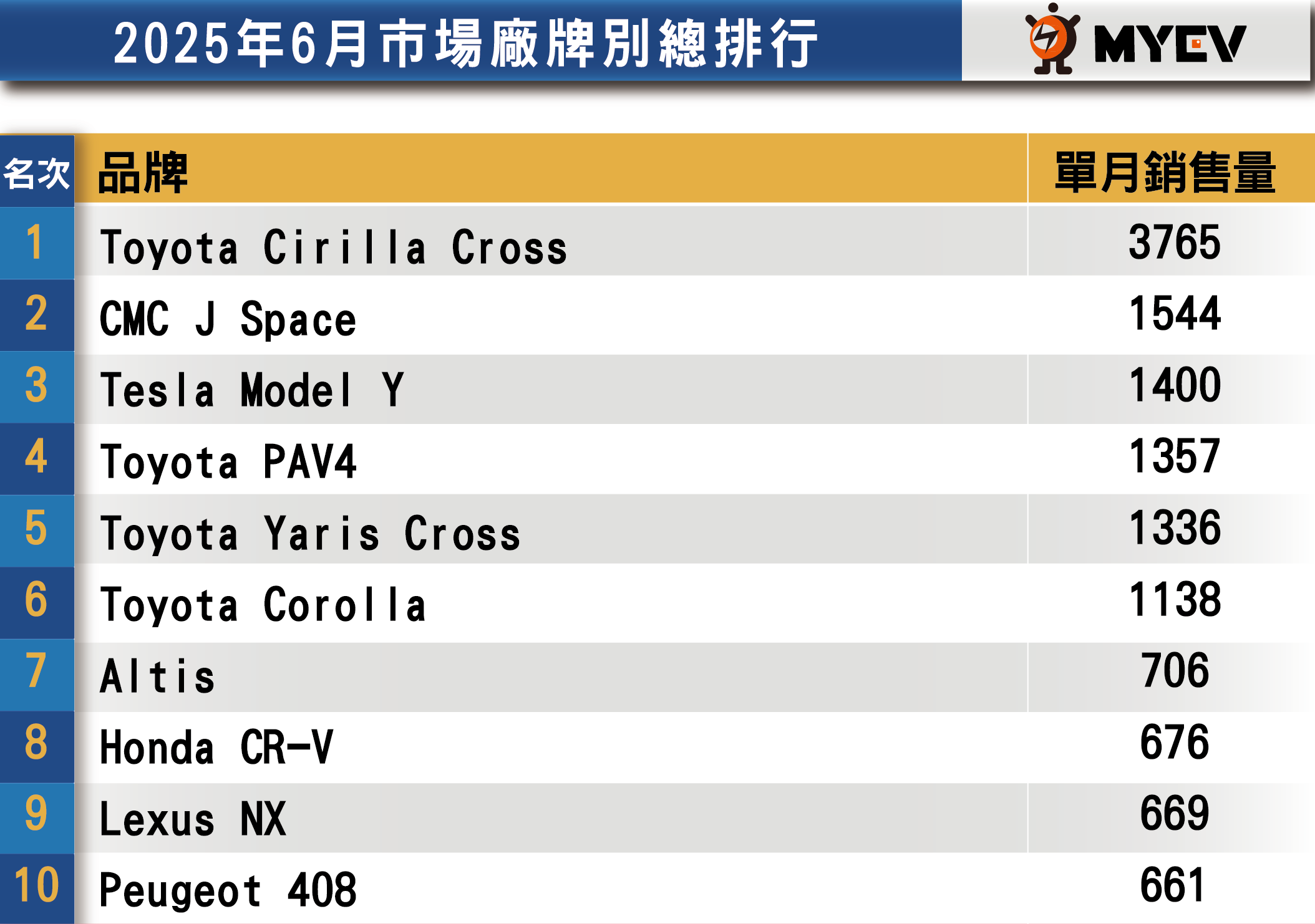 品牌市占率部分,和泰汽車旗下TOYOTA與LEXUS在6月合計掛牌1萬1458輛,穩居市場龍頭,市占率高達33.4%。TOYOTA單月掛牌9728輛,年增0.4%;LEXUS則以1730輛穩坐高級品牌第二名,僅次於賓士的1840輛。